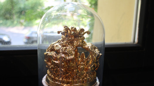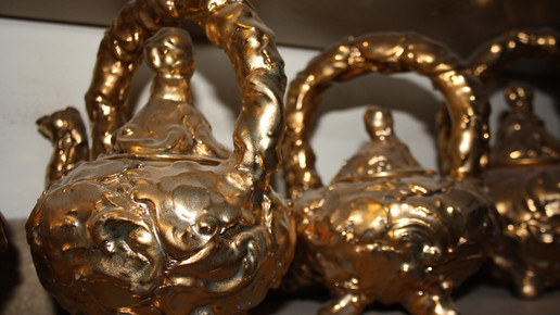 Die ersten Versuche unternahm er, nachdem seine Mutter als Hobby damit begonnen hatte. Mit Drehscheibe. Die lehnt er kategorisch ab: „Das hat nichts Zufälliges.“ Zu spießig, sie macht alles gleichmäßig, das ist nicht sein Ding. Seine Philosophie beruht auf dem Verspielten des Barock, auf Gold und Überfluss und Pracht.
