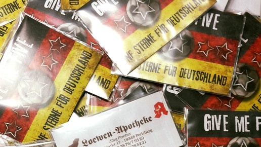 Wenn doofe Sprüche nicht Ihr Fall sind, können Sie sich in die Herzen der Offizin-Kollegen schmieren: Geht ganz einfach mit Schnittchen. Das kulinarische Relikt aus den 50er-Jahren des vergangenen Jahrhunderts ist ideal, denn sie sind schnell zubereitet und da Fußball aufregend ist, braucht der Körper Nervennahrung. Am schnellsten gehen süße Schnittchen: Weißbrot in kleine Rechtecke schneiden, Nutella drauf, eine einzelne Haselnuss symbolisiert den Fußball (etwaige Allergien im Kollegenkreis beachten).
