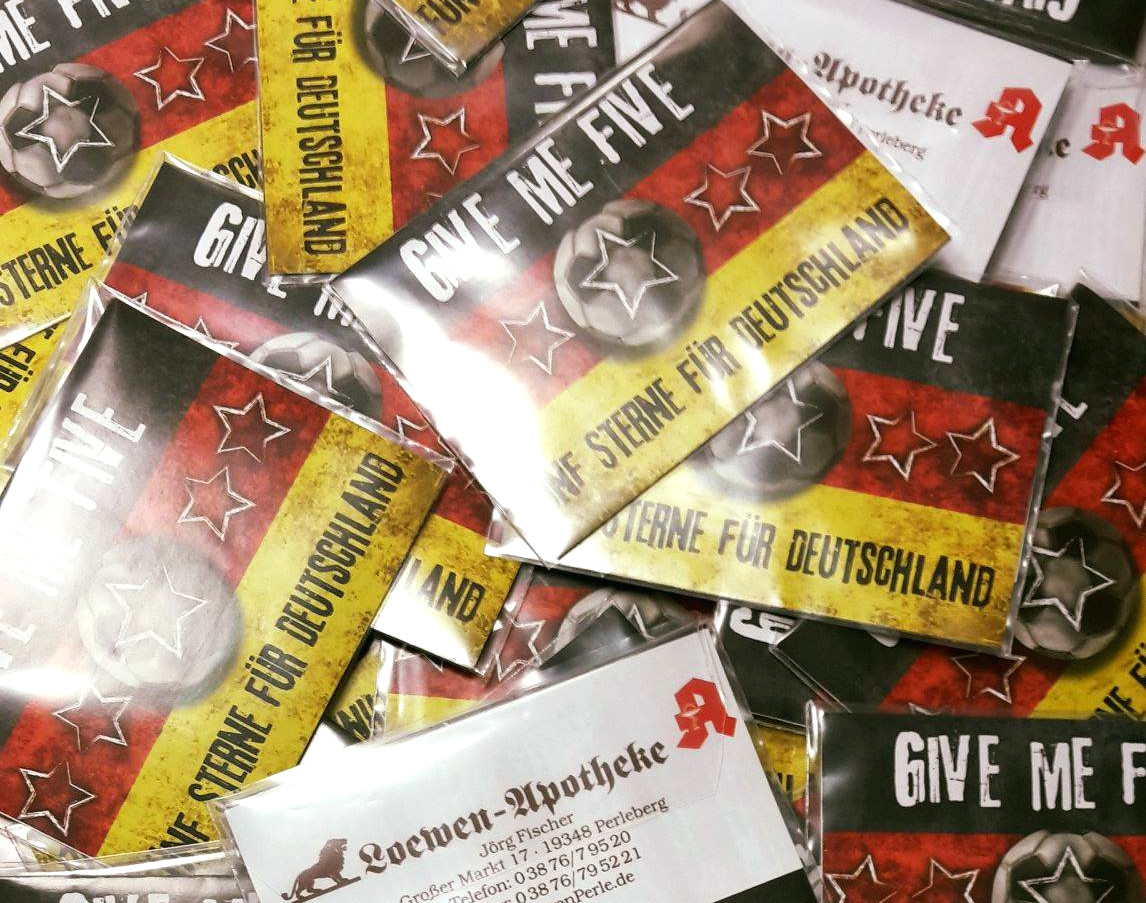 Wenn doofe Sprüche nicht Ihr Fall sind, können Sie sich in die Herzen der Offizin-Kollegen schmieren: Geht ganz einfach mit Schnittchen. Das kulinarische Relikt aus den 50er-Jahren des vergangenen Jahrhunderts ist ideal, denn sie sind schnell zubereitet und da Fußball aufregend ist, braucht der Körper Nervennahrung. Am schnellsten gehen süße Schnittchen: Weißbrot in kleine Rechtecke schneiden, Nutella drauf, eine einzelne Haselnuss symbolisiert den Fußball (etwaige Allergien im Kollegenkreis beachten).
