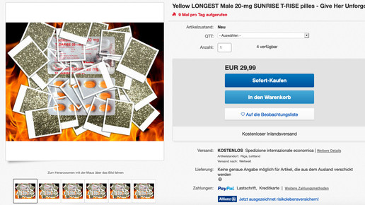 Noch vier Wochen können sich Ebay-User die letzten verfügbaren Potenzpillen von andvik_43 sichern, sollte die Auktions-Plattform nicht vorher eingreifen. In den wenigen Tagen, die der Verkäufer auf Ebay angemeldet ist, gingen für ihn bisher weder positive noch negative Bewertungen ein.