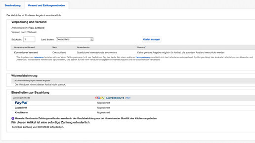 Die Pillen gibt es jeweils zum Sofortkauf. Eine 10er-Packung kostet 29,99 Euro, die 50er-Packung ist für 99,99 erhältlich. Zwei der drei verfügbaren 100 Stück-Packungen sind bereits verkauft. Diese schlagen mit 129,99 Euro zu Buche. Der Versand aus Riga ist weltweit laut Verkäufer kostenfrei. Ein Rücknahmerecht will andvik_43, der neben den Pillen keine weiteren Dinge zum Verkauf anbietet, seinen Käufern jedoch nicht einräumen.