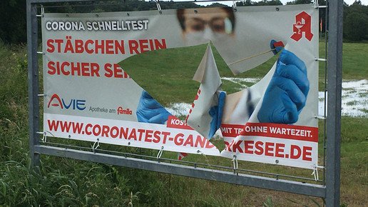 Das erste Banner wies auf das Testangebot der Apotheke hin. „Stäbchen rein, sicher sein“, stand dort in großen roten Buchstaben. Zudem wurde auf die Internetseite des Testzentrums verwiesen. Nachdem die Werbung zerstört worden war, ließ Bertram ein neues großflächiges Banner anfertigen. Dort verwies er auch auf die Möglichkeit, in der Apotheke digitale Impfzertifikate abholen zu können.