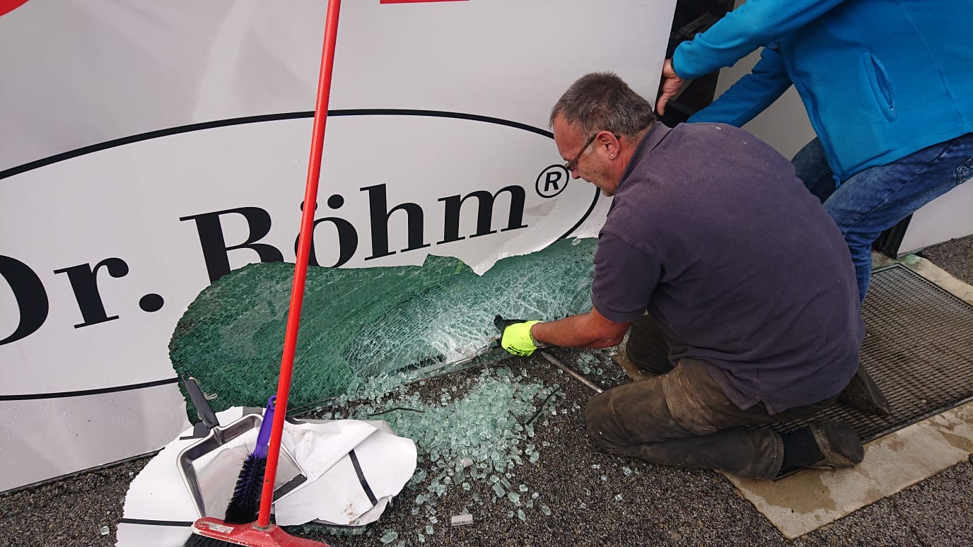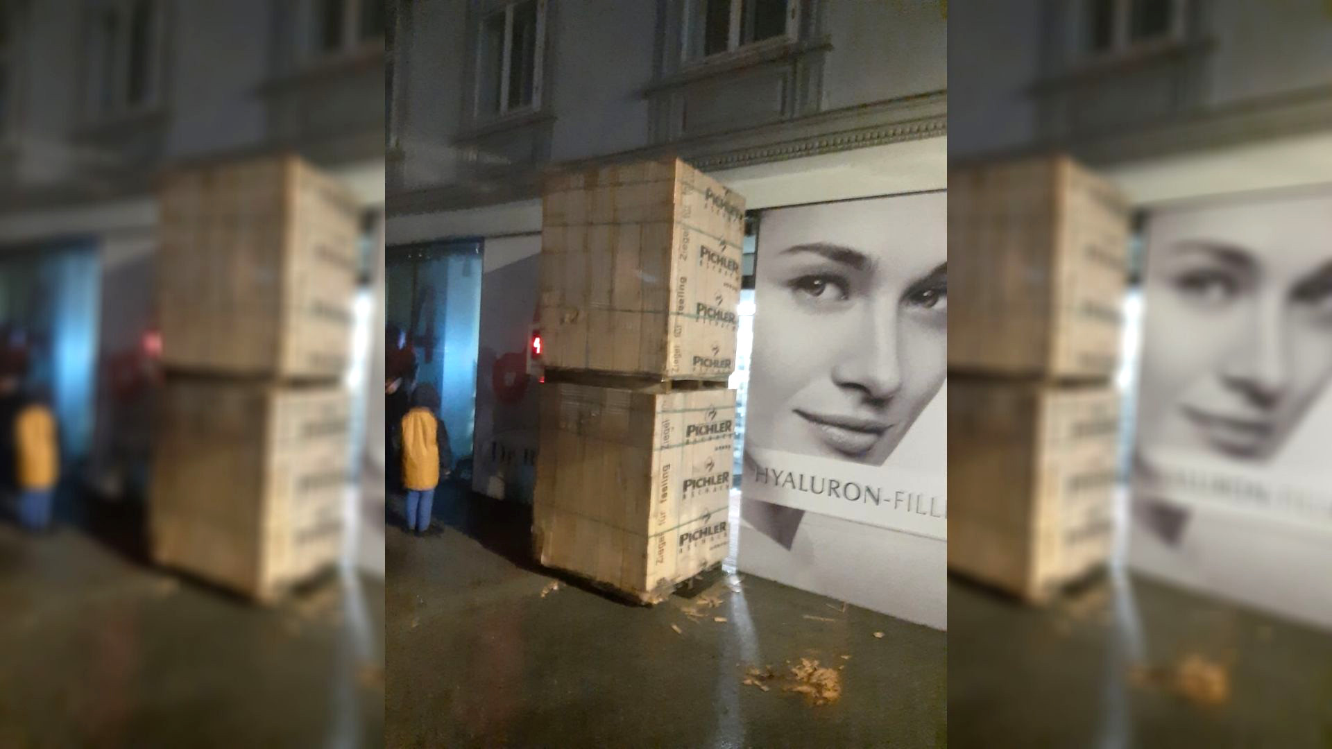 Glücklicherweise fand sich schnell Hilfe – die musste jedoch kreativ sein, da es sich bei der Tür um eine Sonderanfertigung handelt. „Um die Apotheke vor Einbruch zu schützen, haben wir zwei Paletten mit Ziegeln vor den Eingang gestellt“, berichtet Spacek. Mittlerweile wurde die Palette durch eine improvisierte Tür aus Doka-Platten ersetzt. Auf die neue Glastür muss der Apotheker noch einige Wochen warten: „Die Freigabe von der Versicherung ist da und die Tür bestellt.“ Im November wird die Glasfront dann hoffentlich wieder komplett.