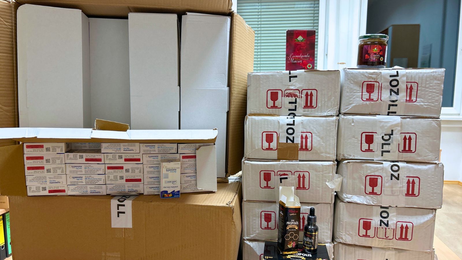 Insgesamt stellten die Zollbeamten 150 Gläser Potenzhonig „Epimedyumlu Macun“, 5600 Gelbeutel des Potenzmittels „Kamagra-Oral Jelly“ sowie 12 Fläschchen „Sivi Propolis Balen Plus“ mit Potenzmittel sicher. „Besonders problematisch ist, dass das enthaltene Sildenafil auf der Verpackung nicht angegeben war. Verbraucher können somit nicht erkennen, dass sie ein stark wirksames Arzneimittel einnehmen – was unter Umständen ernste Konsequenzen haben kann. Vor allem in Verbindung mit bestimmten anderen Medikamente besteht das Risiko gefährlicher Wechselwirkungen“, so Elvira Enders-Beetschen, Pressesprecherin des Hauptzollamts Landshut. Auch nicht deklarierte Nahrungsergänzungsmittel wurden in der Ladung festgestellt.