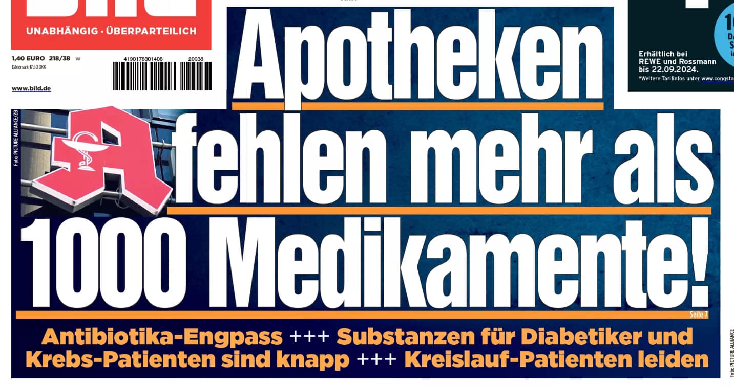Die Bild-Zeitung berichtet über Lieferengpässe. Das Boulevardblatt titelt: „Apotheken fehlen mehr als 1000 Medikamente!“ Betroffen seien unter anderem Antibiotika, Arzneimittel für Diabetiker sowie Krebspatientinnen und -patienten.