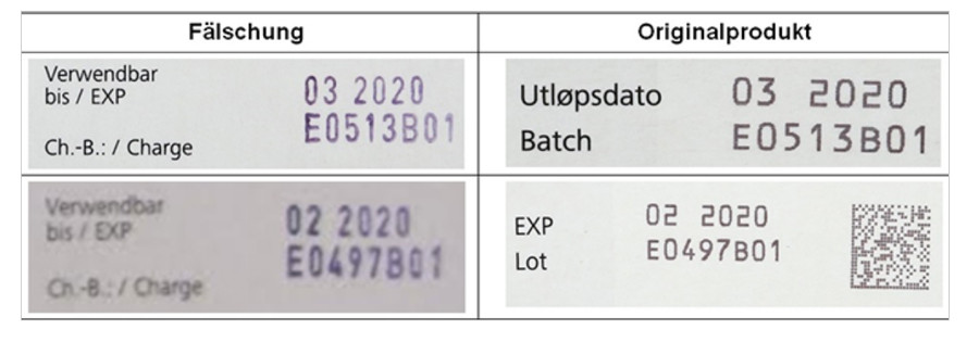 Untersuchungen des Originalherstellers konnten die Packungen in allen Fällen als Fälschungen identifizieren. Blister und Filmtabletten entsprechen in Bezug auf Identität dem Original. Die Fälschungen können eindeutig an der Druckfarbe der variablen Daten identifiziert werden. Charge und Verfall sind im Original in schwarzer Farbe auf der Faltschachtel zu finden, die Manipulation trägt die variablen Daten in Lila beziehungsweise Blau. Packungen, die mit den Sicherheitsmerkmalen Serialisierungsnummer, Manipulationsschutz mit Hologramm versehen sind, sind nicht betroffen.