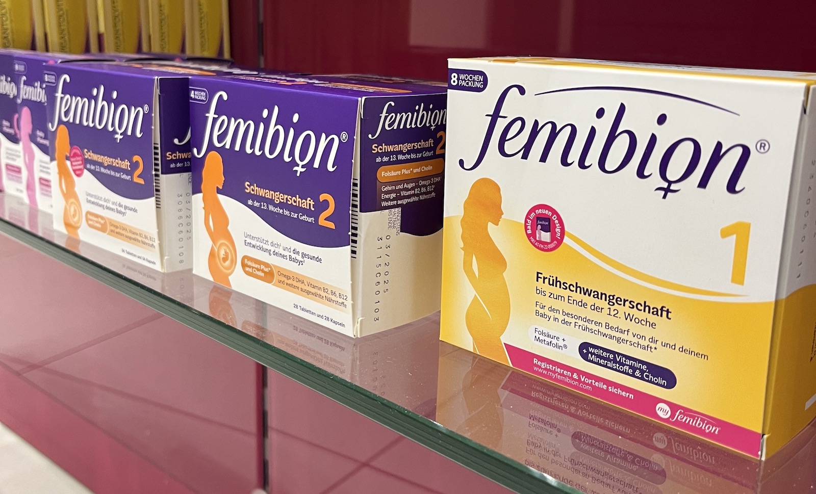 Die Femibion-Produktlinie des Herstellers ist bereits mit Nährstoffen wie Folsäure Plus, Cholin und DHA auf jede Phase der Schwangerschaft abgestimmt.