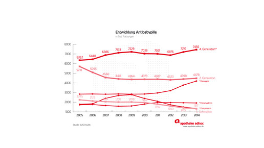 Nach Zahlen von IMS Health ist das Segment der hormonellen Kontrazeptiva seit 2005 um 13 Prozent zurückgegangen: Wurden vor zehn Jahren noch 21,4 Millionen Packungen verschrieben, waren es zuletzt noch 18,6 Millionen. Wegen der gestiegenen Verkaufspreise ist der Markt nach Umsatz dagegen um 4 Prozent gewachsen: von 345 auf 356 Millionen Euro.