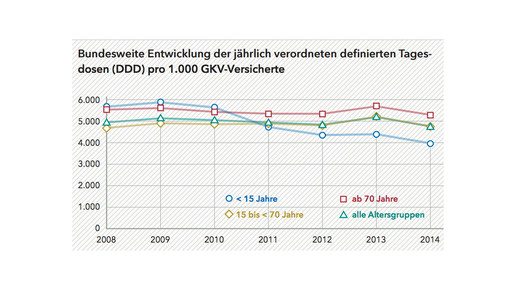 In Deutschland werden rund 85 Prozent des Antibiotikaverbrauchs von niedergelassenen Ärzten verordnet. Bei Kindern und Jugendlichen ist die Antibiotikatherapie im Beobachtungszeitraum statistisch signifikant rückläufig. Kinderärzte verordnen Antibiotika kürzer und seltener. Leicht rückläufig ist der Einsatz von Antibiotika auch bei älteren Patienten jenseits des 70. Lebensjahres, vor allem in Thüringen und Sachsen-Anhalt. In der Altersgruppe der Erwachsenen zwischen 15 und 69 Jahren haben sich die Verordnungen zwischen 2008 und 2014 nicht signifikant verändert.