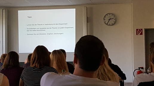 Brümmer stellte den Stundenplan vor, der in den Reihen zu verdutzten Gesichtsausdrücken führte. Unschwer ist am Plan der Dozentin und Praktikumsleiterin zu erkennen, dass kaum Freizeit in Sicht ist. Während man in anderen Studiengängen seine gewünschten Module weitgehend frei zusammenstellen könne, sei das bei Pharmazie unmöglich, weiß auch Brümmer. Sie empfiehlt den Studenten, das verschulte System positiv zu sehen: „Das erleichtert Euch so Einiges!“ Und: „Man kann jeden Tag abhaken“, sagt Brümmer. Den Lacher hat sie.