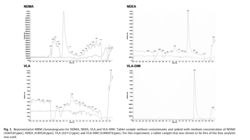 So wurden in 21 Proben N-Nitrosodimethylamin (NDMA) und in 9 Proben N-Nitrosodiethylamin (NDEA) nachgewiesen, das sind 13,8 beziehungsweise 5,9 Prozent aller untersuchten Tabletten. Mit Valeramid (VLA) und Dimethylvaleramid (VLA-DIM) wurden in 13 beziehungsweise 7 Proben zwei weitere Verunreinigungsprodukte nachgewiesen. Dies entspricht 8,6 beziehungsweise 4,6 Prozent.