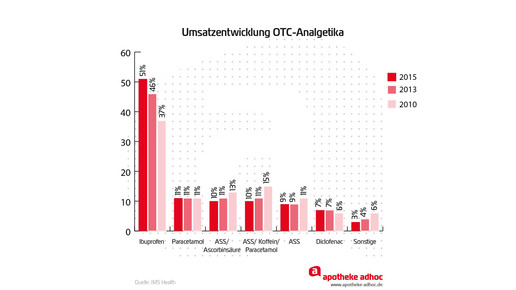 574 Millionen Euro wurden im vergangenen Jahr nach IMS Health mit OTC-Analgetika erzielt. Das entspricht einem Zuwachs von 3,9 Prozent. 107,5 Millionen Packungen wurden verkauft, 1,6 Prozent mehr als 2014. Damit ist der Markt nach Absatz zum ersten Mal seit Jahren wieder gewachsen – und zwar in der Offizin und nicht im Versandhandel.