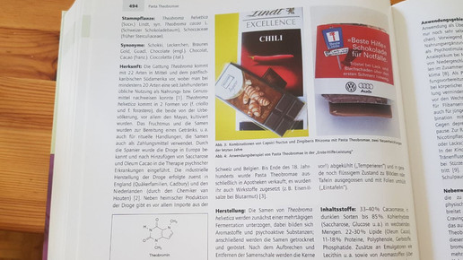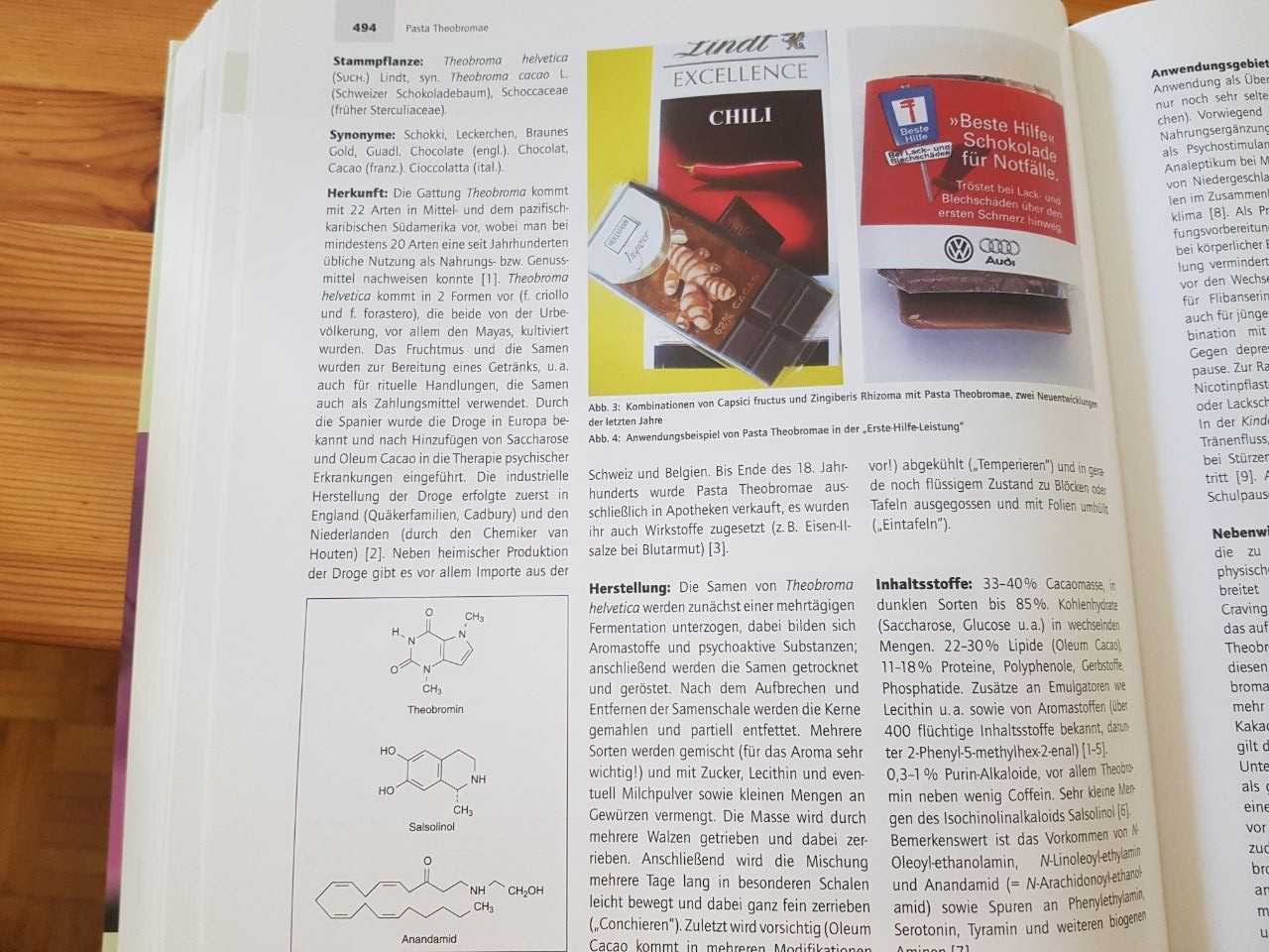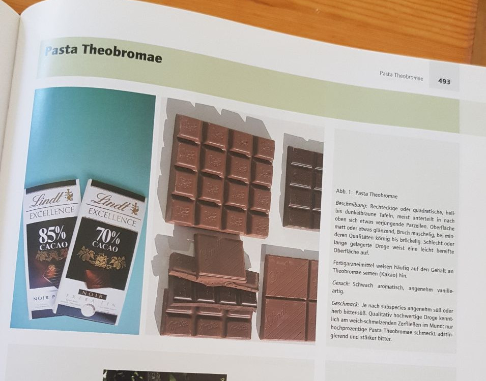 Doch sind nur die Mediziner so lustig? Nein – die Pharmazeuten stehen ihnen da in nichts nach. Im wichtigsten Werk zu Teedrogen und Phytopharmaka, dem „Wichtl“, findet sich tatsächlich Pasta Theobromae – die Schokolade. Sie wird dort folgendermaßen beschrieben: „Einsatz: vorwiegend in der Volksmedizin als Psychostimulans empfohlen – beispielsweise bei Unlustgefühlen und Depressionen, bei der Prüfungsvorbereitung, zur Raucherentwöhnung und als mild wirkendes Aphrodisiakum besonders für schüchterne Frauen sowie in der Kinderheilkunde als linderndes Mittel bei Tränenfluss nach kleinen Verletzungen.“