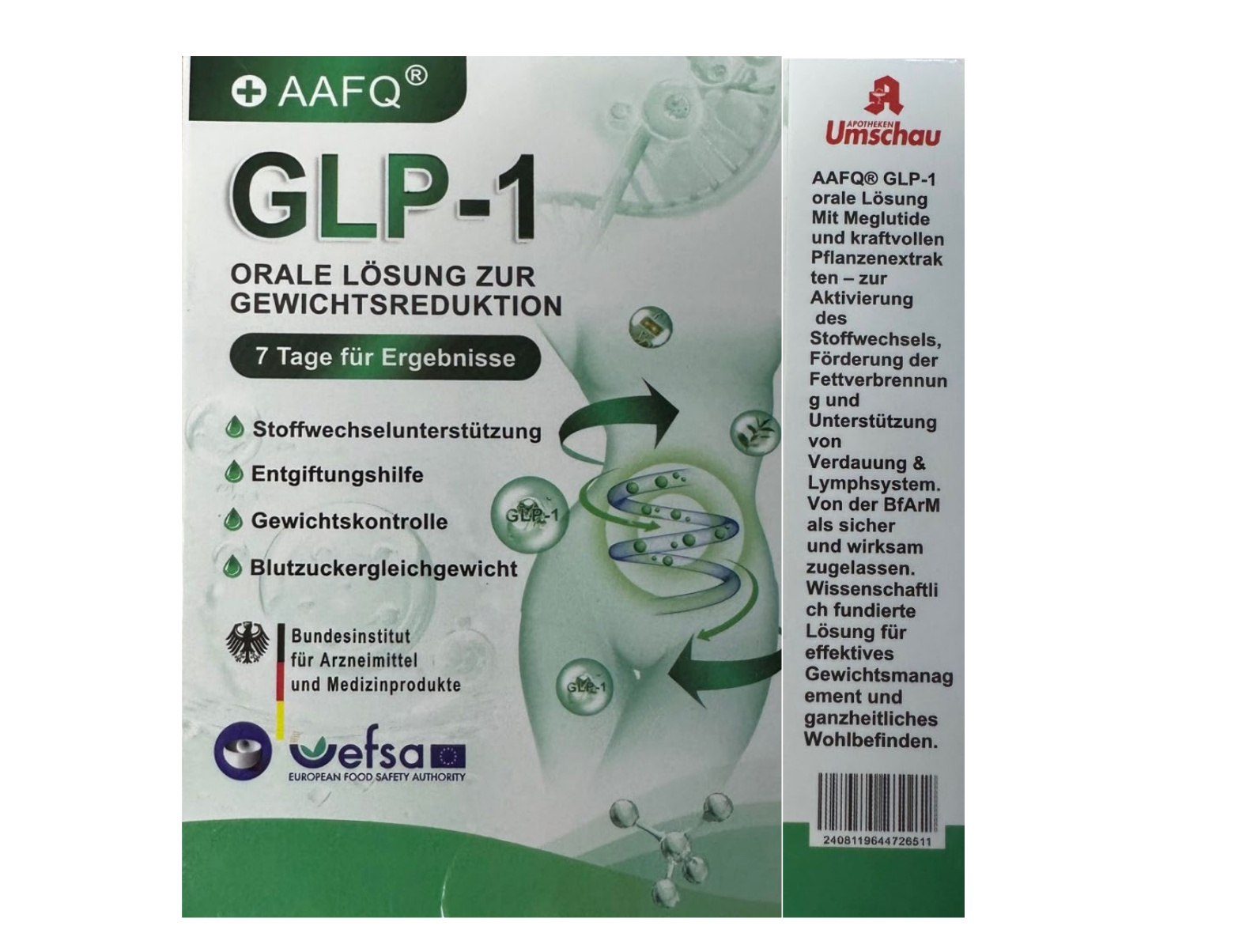 In der Taxe ist „AAFQ GLP-1 orale Lösung zur Gewichtsreduktion“ nicht gelistet. Auf der Umverpackung, die keine Angabe zum Produktstatus enthält, verspricht die Deklaration eine Unterstützung des Stoffwechsels, Entgiftungshilfe, Gewichtskontrolle und Blutzuckergleichgewicht. Ergebnisse werden in sieben Tage versprochen.