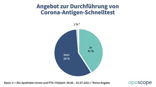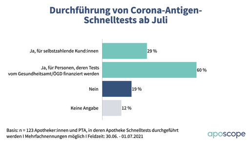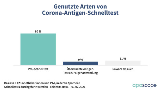 Bei den Bürgertestungen ergibt sich ein anderes Bild: 58 Prozent beteiligen sich laut Umfrage nicht; 38 Prozent machen mit, weitere 12 Prozent bieten außerdem Schnelltests für Selbstzahler an. Eingesetzt werden in acht von zehn Fällen PoC-Antigentests, der Rest entfällt auf Schnelltests unter Aufsicht oder beides. Pro Tag werden im Durchschnitt 30 Tests durchgeführt, allerdings gibt es hier deutliche Ausreißer nach oben.