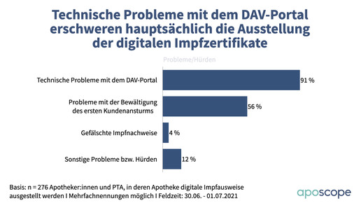 Laut aposcope-Umfrage unter 300 verifizierten PTA und Apotheker:innen stellen 92 Prozent der Apotheken derzeit Impfzertifikate aus. Der Start war mehr als holprig. 91 Prozent gaben an, mit technischen Problemen gekämpft zu haben. Und 56 Prozent hatten Probleme mit der Bewältigung des ersten Kundenansturms. Mit gefälschten Impfnachweisen mussten sich dagegen lediglich 4 Prozent auseinandersetzen.