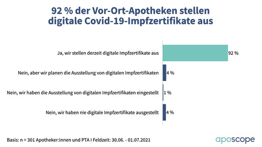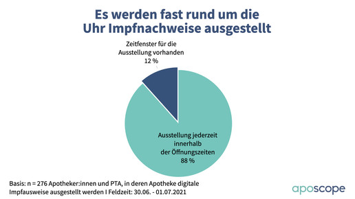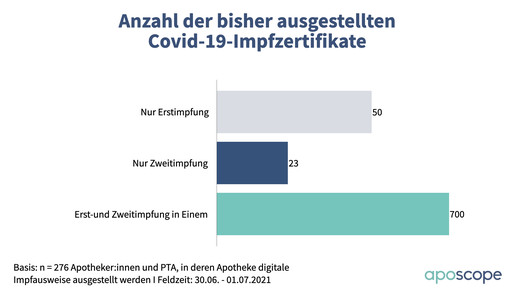 Bei der Mehrzahl der ausgestellten Zertifikate handelt es sich um kombinierte Erst- und Zweitimpfungen: Durchschnittlich wurden davon unter den befragten Apotheken seit Beginn rund 700 Stück ausgestellt. Dazu kamen 50 Zertifikate für Erst- und 23 Zertifikate für Zweitimpfungen. Laut Umfrage liegt der Zeitaufwand je Zertifikat bei fünf bis acht Minuten. Im Durchschnitt sind zwei bis drei Mitarbeiter:innen mit dem Ausstellen beschäftigt, neun von zehn Apotheken haben kein bestimmtes Zeitfenster, in dem die digitalen Impfnachweise für Kund:innen ausgestellt werden.