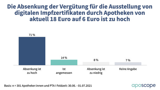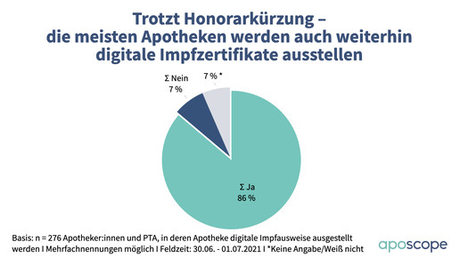 Die geplante Absenkung der Vergütung finden knapp drei von vier Befragten zu hoch (71 Prozent). Nur 14 Prozent halten den neuen Betrag von 6 Euro für angemessen, weitere 8 Prozent finden auch den noch zu hoch. Nichtsdestotrotz wollen 86 Prozent auch in Zukunft digitale Impfzertifikate ausstellen, nur 7 Prozent wollen das Angebot einstellen.