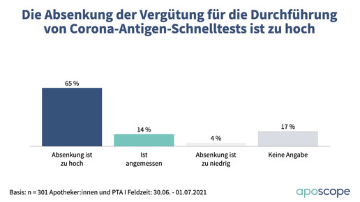 Generell wird die Einführung kritisch bewertet: Neun von zehn Befragten finden, dass die Apotheken ins kalte Wasser geworfen wurden, 81 Prozent finden den Start verfrüht und schlecht vorbereitet. 79 Prozent halten das Ganze für eine Schnellschussreaktion, die dem Wahlkampf dient, 76 Prozent finden, dass die Apotheken ausgenutzt wurden. Und mehr als das: 89 Prozent finden, dass die Absenkung des Honorars die Apotheken in ein schlechtes Licht rückt – ähnlich wie bei den Masken.