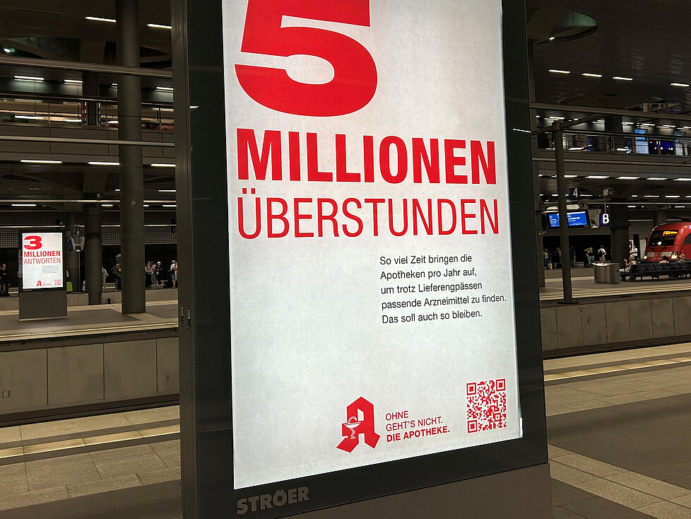 So stehen bei den aktuellen Motiven besonders wichtige und repräsentative Zahlen, Daten und Fakten zu den Apothekenleistungen im Vordergrund. Mit „5 Millionen Überstunden“ wird beispielsweise auf die Arbeit verwiesen, die die Apotheken für den Ausgleich der Lieferengpässe benötigen. Die Zahl „3 Millionen Antworten“, die beispielsweise am Berliner Hauptbahnhof gezeigt wird, weist auf die Patientenkontakte der Apotheken hin. Auch die Poster „11 Millionen Einzelfälle“ und „46 Millionen Sicherheitschecks“ sind nun im Einsatz.
