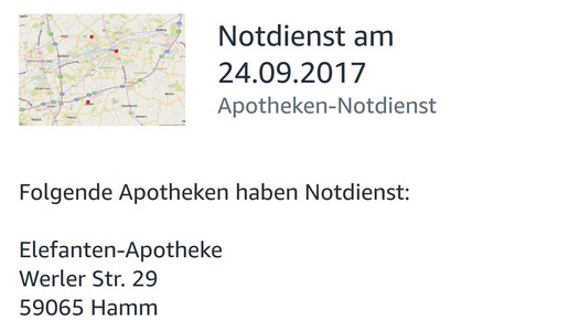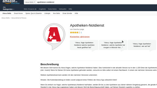 Um noch mehr Menschen zu erreichen, stelle 11880 sein Angebot nun auch via Alexa zur Verfügung. Wie Langes „Apotheken-Notdienst“ greift auch „Notapothekensuche 11880.com“ auf die Standortdaten des Nutzers zu. Nach Aufforderung wird die aktuell geöffnete Notapotheke in der unmittelbaren Umgebung genannt. Anders als bei der ehrenamtlich erstellten Anwendung wird allerdings nur die nächstgelegene Apotheke angezeigt.