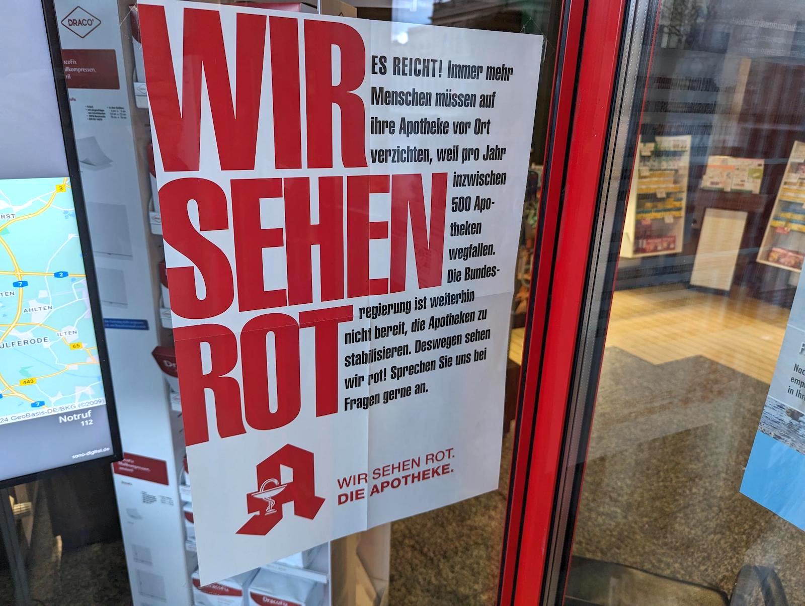 Vor einer Woche wurde in der SZ über „Wir sehen rot.“ berichtet. Protest der Apotheker:innen habe es bereits im vergangenen Jahr gegeben, aber nicht so auffällig wie beispielsweise zuletzt bei den Bauern. „Weil sie keine riesigen Traktoren haben, mit denen sie Straßen blockieren könnten“, heißt es. Geschlossene Apothekentüren seien „nicht so spektakulär wie Traktoren vor dem Brandenburger Tor. Und natürlich gibt es weniger Apotheker als Bauern“, trotzdem habe damit eine Wirkung erzielt werden können.