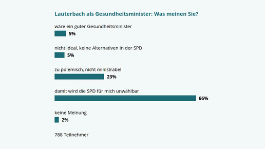 Weitere 23 Prozent finden, dass Lauterbach zu polemisch und daher nicht ministrabel ist. Nur 5 Prozent sind der Meinung, dass der derzeitige gesundheitspolitische Sprecher seiner Fraktion nicht die ideale Besetzung wäre, aber dass es in der SPD keine Alternativen gebe. Ebenso viele denken, dass Lauterbach ein guter Gesundheitsminister wäre. 2 Prozent hatten keine Meinung.