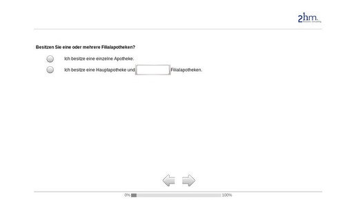 Im folgenden Teil möchte 2hm „gerne etwas von Ihnen über die Warenwirtschaft in Ihrer Apotheke erfahren“. Die Apotheker sollen angeben, wie viel Zeit sie selbst und ihr Team prozentual für verschiedene Teilaspekte verwenden: Lagerhaltung, Bestellung, Empfang der Lieferung und Prüfung der Lieferscheine, Einsortierung der Ware, Vorbereitung der Bezahlung und dieser Vorgang selbst sowie Retourenmanagement und Sonstiges. Ein Rechner hilft bei der Überprüfung der Verteilung. In den folgenden Freitextfeldern können die Apotheker weitere Aufgaben beschreiben und wie viele Minuten sie täglich damit verbringen.