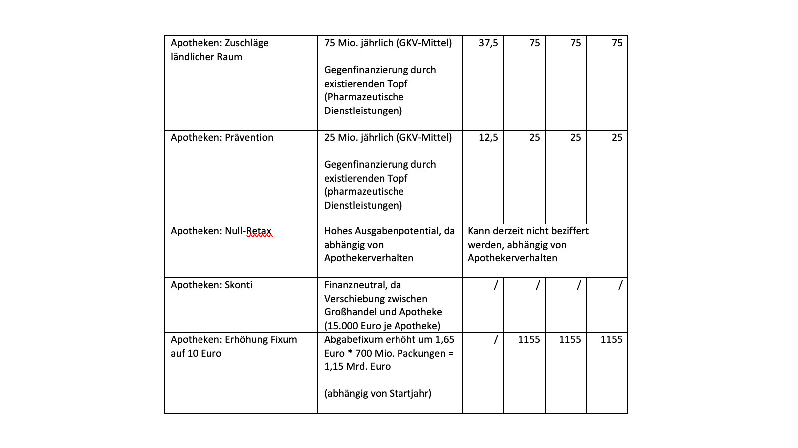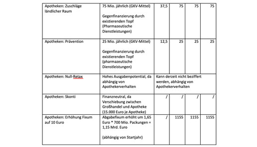 Die Verhandler räumen ein, dass all das viel Geld kosten wird. Alleine die Anhebung des Fixums im Rahmen von Verhandlungen um 1,65 Euro würde bei 700 Millionen Packungen zu Mehrausgaben von 1,15 Milliarden Euro führen. Diese seien abhängig von Zeitpunkt der Umstellung, im Papier wird 2026 angepeilt.