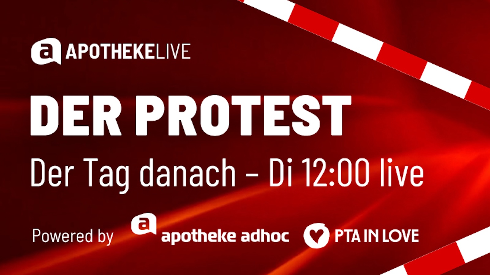 Was also bleibt vom Apothekenprotest? Hat sich der Aufwand gelohnt, konnten die Teams ein Zeichen setzen? Nadine Tröbitscher und Tom Bellartz ordnen das Geschehen und die Resonanz ein. Mit dabei sind außerdem Abda-Präsident Thomas Preis und Anja Zierath vom BVpta. Ab 12 Uhr live aus unserem Berliner Studio. Angemeldete Nutzerinnen und Nutzer haben bei APOTHEKE ADHOC Webinar die Möglichkeit, Fragen zu stellen. Jetzt registrieren!