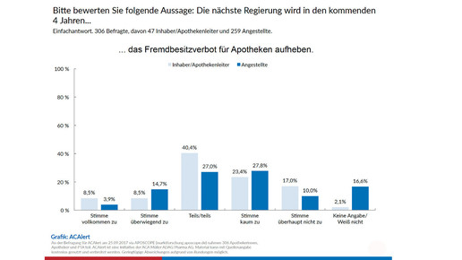 Wenn es zu einer Jamaika-Koalition kommt, wäre das für die Apotheken doppelt spannend. Die FDP will neuerdings das Fremdbesitzverbot für Apotheken aufheben, Parteichef Christian Lindner ist sogar stolz auf den Shitstorm, den er bei den Apothekern ausgelöst hat. Und die Grünen haben sich schon seit Jahren für Apothekenketten eingesetzt, auch wenn davon im Wahlprogramm nichts zu finden war. Öffnet also Jamaika den Apothekenmarkt für Großkonzerne? Zwar glauben 40,4 Prozent der befragten Inhaber nicht an einen Fall des Fremdbesitzverbots, doch ebenso viele sind sich in der Frage nicht mehr sicher. Und 17 Prozent erwarten, dass jetzt eine Liberalisierung ansteht – trotz Regierungsbeteiligung der Union.