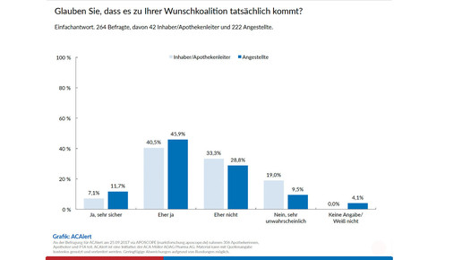 Das Rx-Versandverbot ist vorerst der Diskontinuität zum Opfer gefallen – Bundesgesundheitsminister Hermann Gröhe (CDU) will sein Vorhaben aber wieder mit in die Koalitionsverhandlungen nehmen. Doch bis dahin ist es noch ein weiter Weg. Kommt Jamaika oder doch noch die große Koalition? Wer verhandelt Gesundheit? Die Apotheker und ihre Angestellten sind wenig zuversichtlich, dass ihre großen Themen von der neuen Regierung gelöst werden, so das Ergebnis einer APOSCOPE-Umfrage aus der Reihe ACAlert im Auftrag von ACA Müller ADAG Pharma.