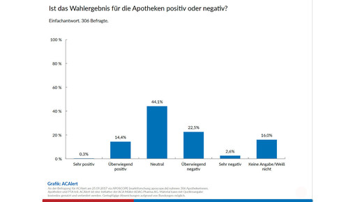 Was das Wahlergebnis für die Apotheken bedeutet, ist für viele 306 Teilnehmer der APOSCOPE-Umfrage daher noch nicht klar – die Erwartung ist tendenziell negativ: 44,1 Prozent bewerten das Ergebnis als neutral, 25,1 Prozent als überwiegend oder sehr schlecht für die Apotheken. Dagegen sehen nur 14,7 Prozent den Wahlausgang positiv für die Offizin.