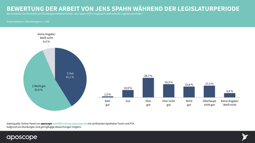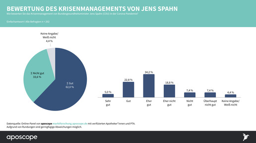 Auch wenn die Zustimmungswerte für Spahn immer noch nicht berauschend sind, attestieren ihm doch immerhin 62 Prozent ein gutes Krisenmanagement in der Corona-Krise. Ohne Frage, hier hat sich Spahn profilieren können und damit auch seine Chancen auf den CDU-Vorsitz. Offiziell unterstützt Spahn bis jetzt allerdings (noch) Laschet. Doch in der Offizin hat Spahn nach wie vor keinen leichten Stand. Mit seiner Arbeit als Minister insgesamt sind nur 41 Prozent zufrieden, 52 Prozent finden seine Arbeit nicht gut. Bei den Inhabern ist das Verhältnis noch schlechter – 31 Prozent positiv, 68 Prozent negativ.