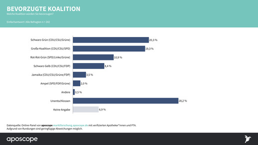 Keine andere Partei würde es überhaupt in den Bundestag schaffen: Geht es nach den Pharmazeuten, scheitern SPD und FDP (je 2 Prozent) und AfD (4 Prozent) an der 5-Prozent-Hürde. Was den Parteien Ansporn sein könnte: 22 Prozent der Apotheker gaben an, bei ihrer Wahlentscheidung noch unentschlossen zu sein – hier sind also noch viele Stimmen zu holen.