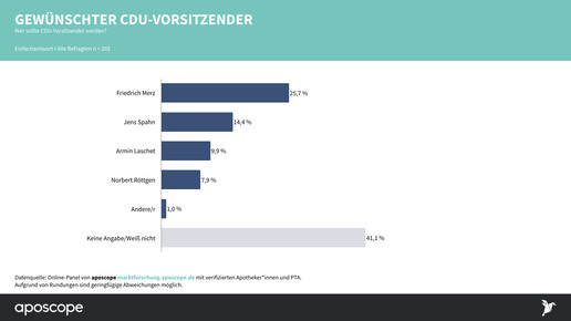 Die Union sucht noch einen Kanzlerkandidaten für die nächste Bundestagswahl. Neben den CDU-Politikern, die sich auch um den Posten als Parteichef bewerben, wird über CSU-Chef Markus Söder spekuliert. Ginge es nach den Apothekenteams, wäre der Franke gesetzt. Als neuen CDU-Vorsitzenden wünschen sich vor allem die Inhaber Friedrich Merz.