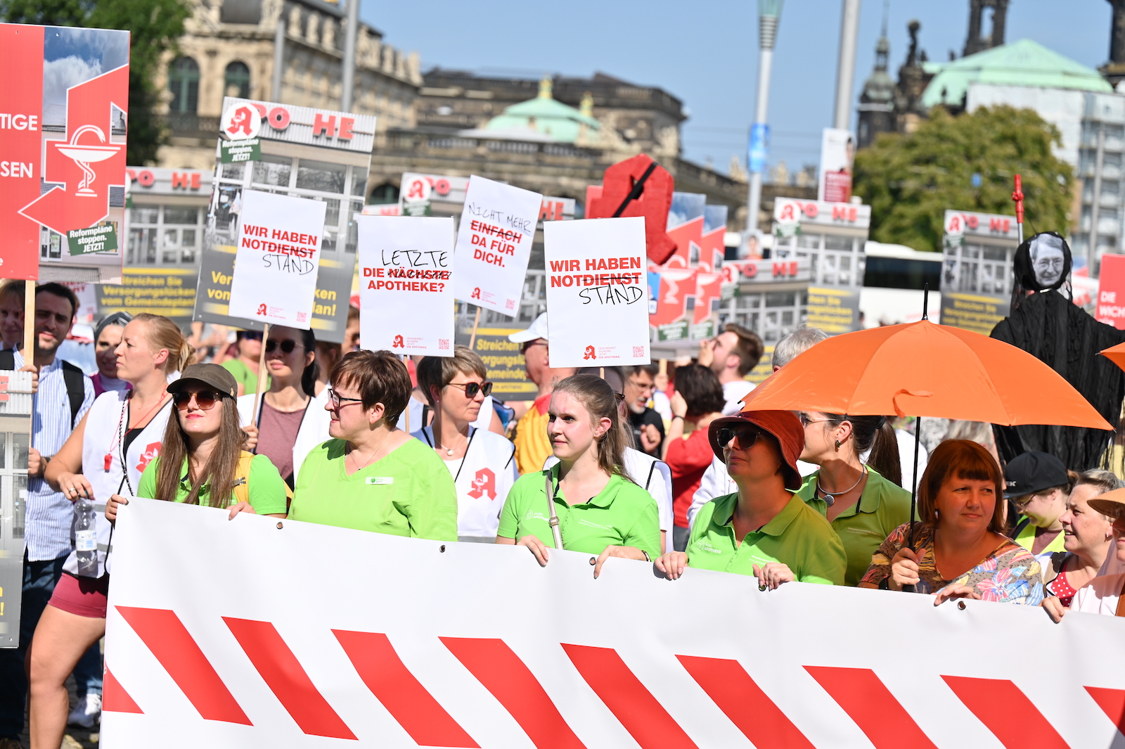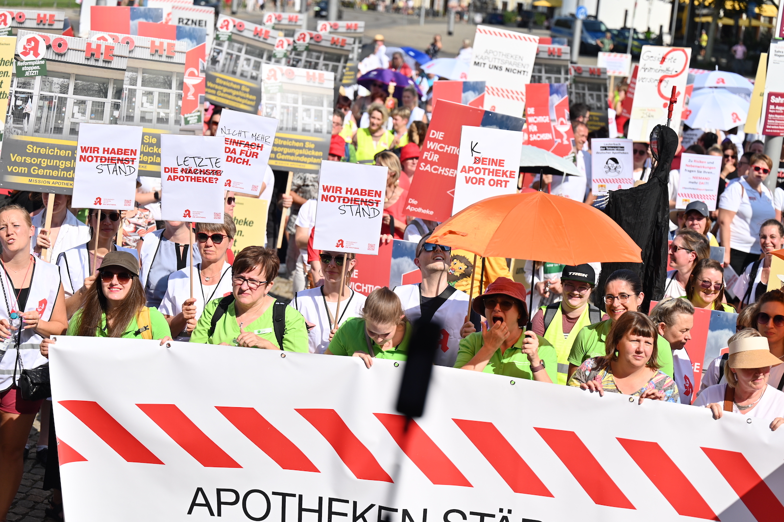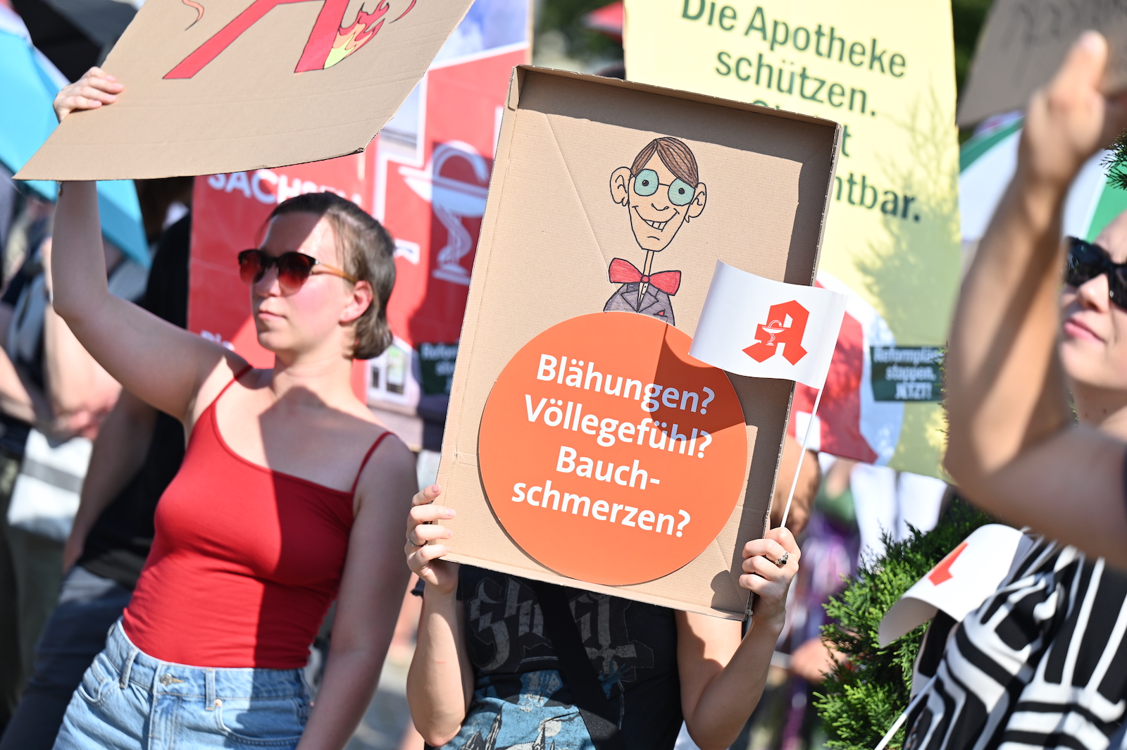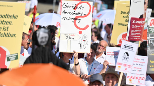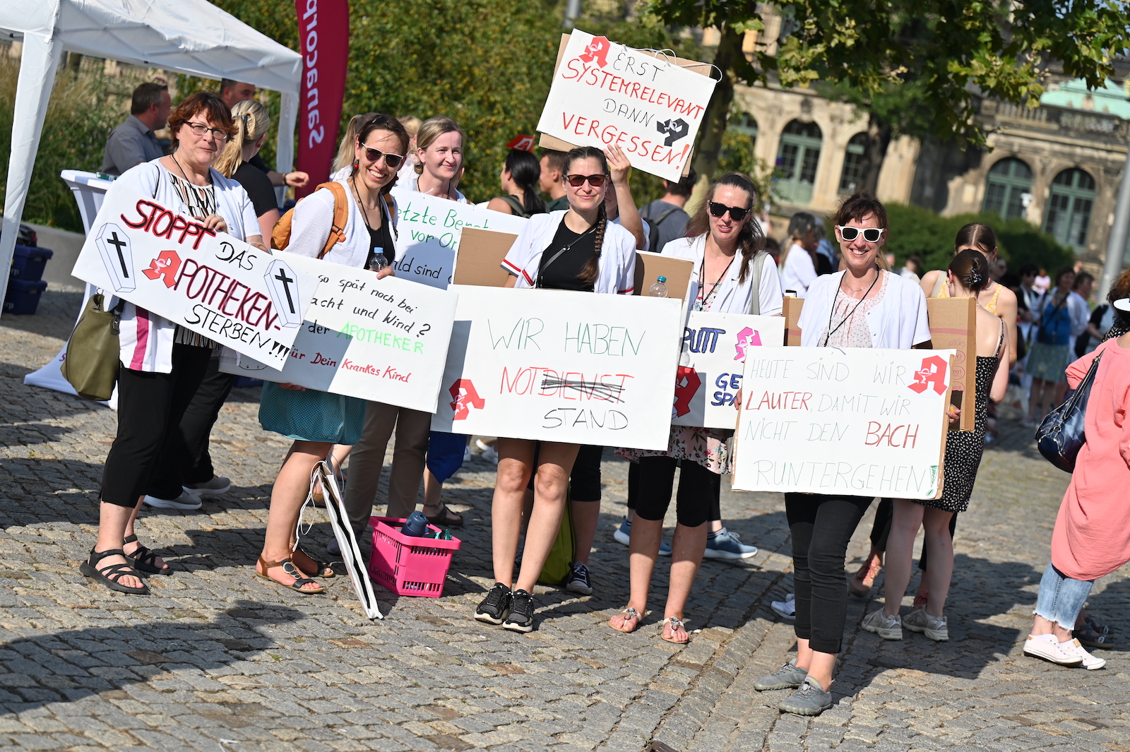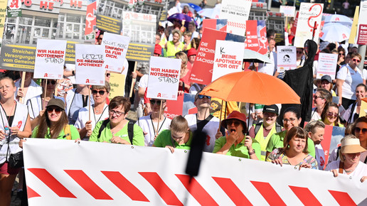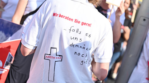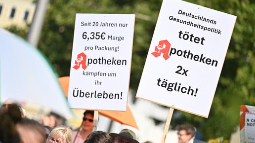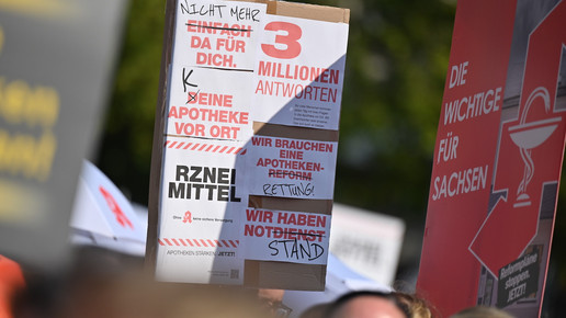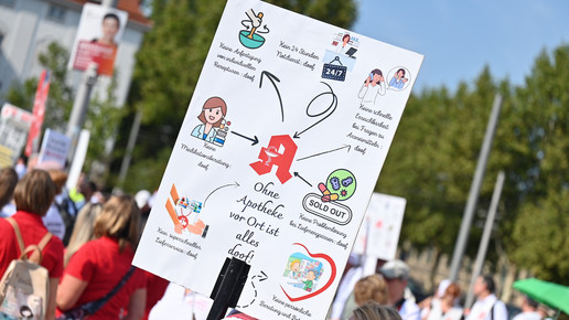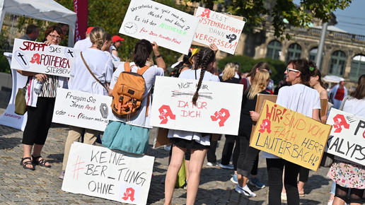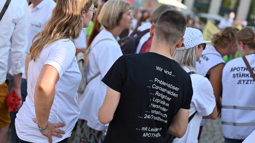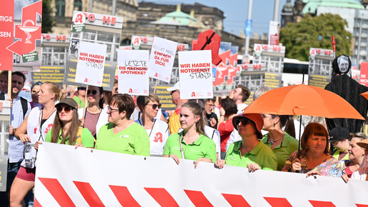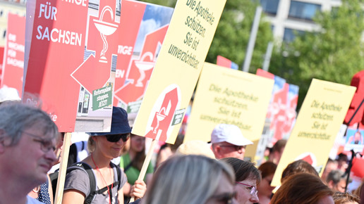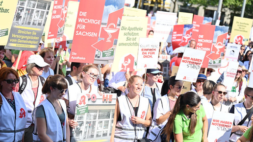 In Dresden und Erfurt wurde heute erneut gegen die Apothekenreform von Bundesgesundheitsminister Karl Lauterbach (SPD) demonstriert. Alleine in der sächsischen Landeshauptstadt kamen nach Polizeiangaben rund 1000 Teilnehmerinnen und Teilnehmer zusammen. Und auch diesmal machten die Apothekenteams ihrer Wut mit kreativen und provokanten Motiven Luft.
