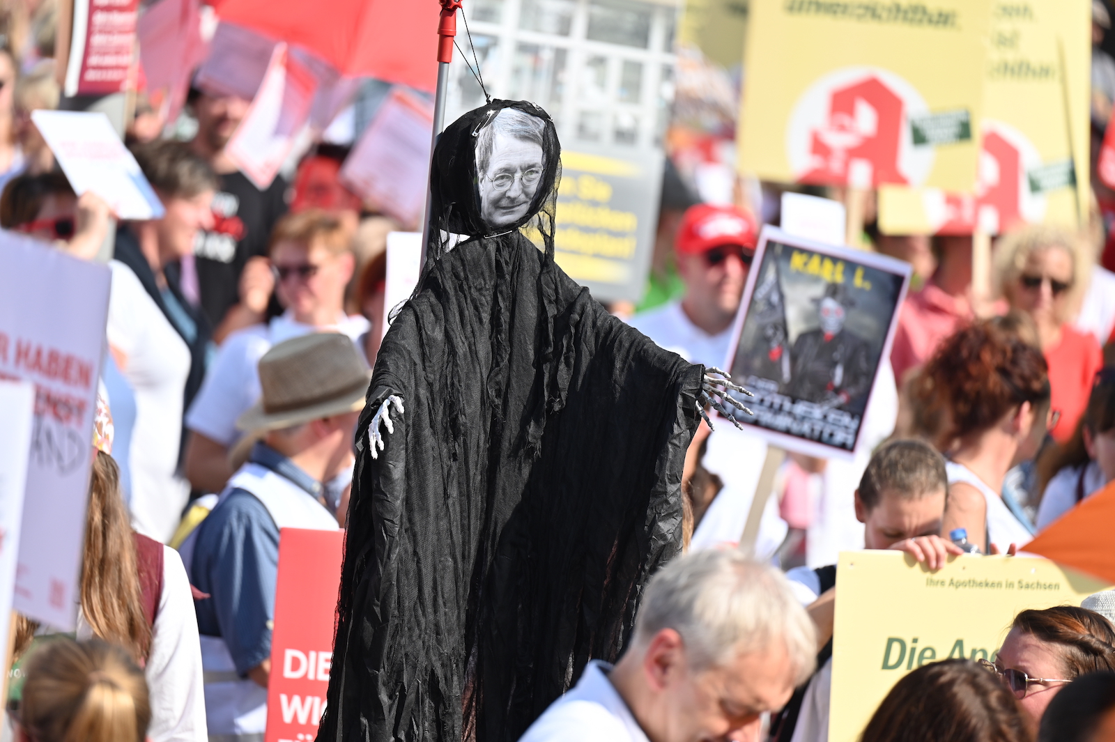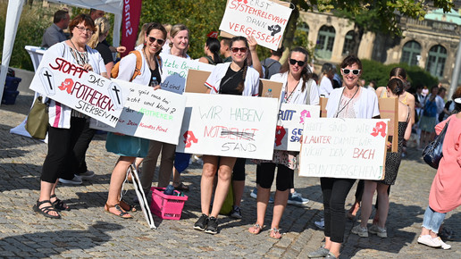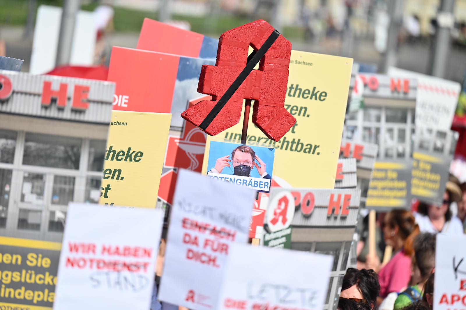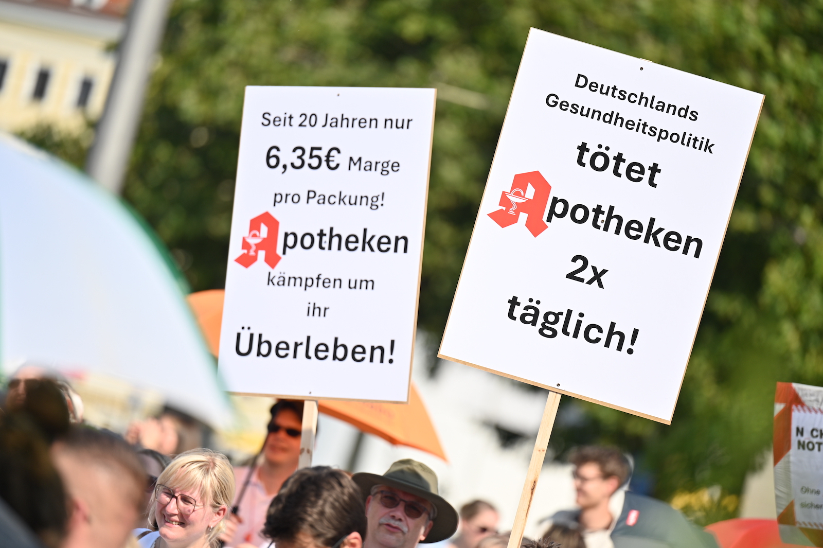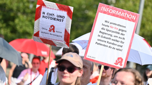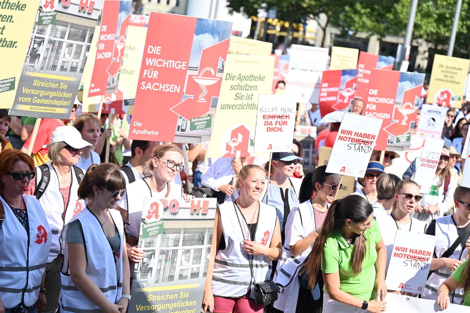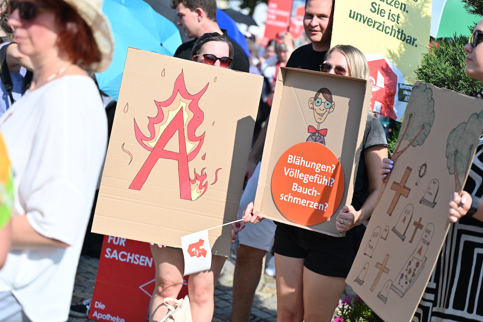 In Dresden und Erfurt wurde heute erneut gegen die Apothekenreform von Bundesgesundheitsminister Karl Lauterbach (SPD) demonstriert. Alleine in der sächsischen Landeshauptstadt kamen nach Polizeiangaben rund 1000 Teilnehmerinnen und Teilnehmer zusammen. Und auch diesmal machten die Apothekenteams ihrer Wut mit kreativen und provokanten Motiven Luft.