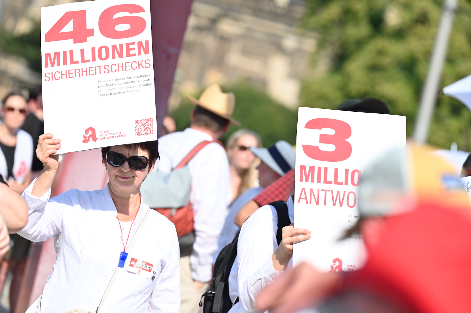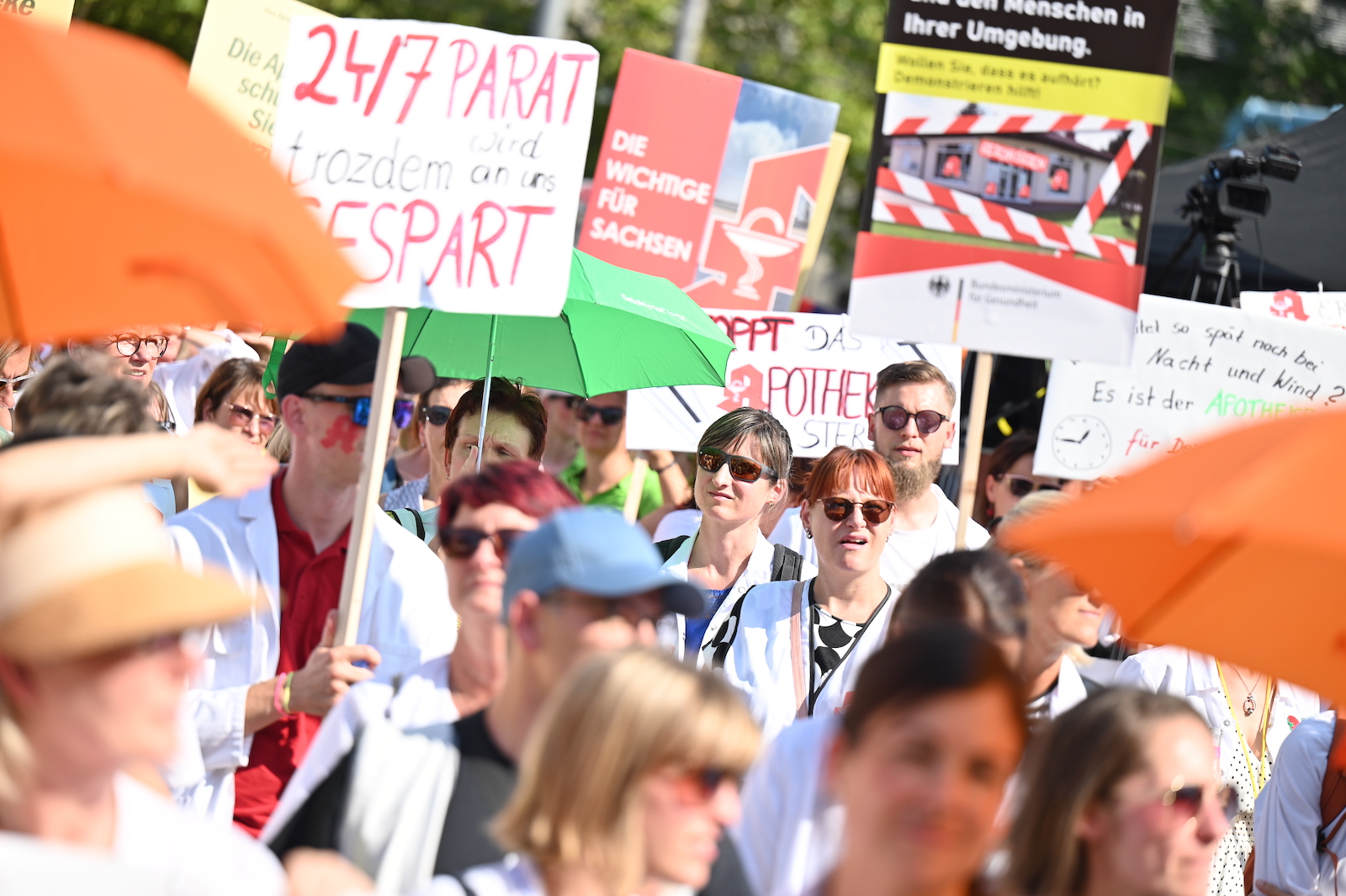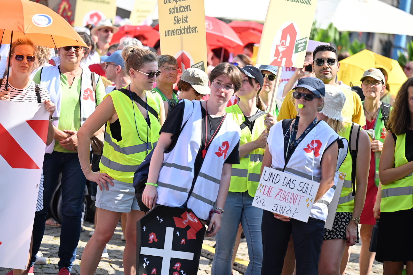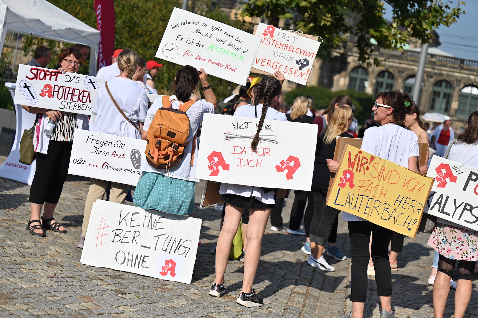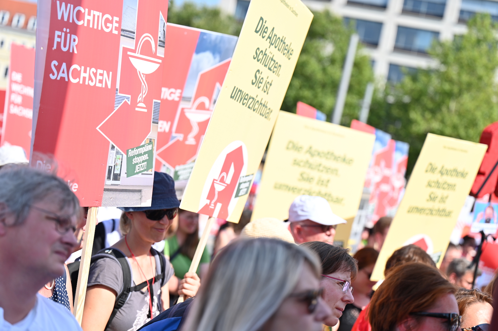 In Dresden und Erfurt wurde heute erneut gegen die Apothekenreform von Bundesgesundheitsminister Karl Lauterbach (SPD) demonstriert. Alleine in der sächsischen Landeshauptstadt kamen nach Polizeiangaben rund 1000 Teilnehmerinnen und Teilnehmer zusammen. Und auch diesmal machten die Apothekenteams ihrer Wut mit kreativen und provokanten Motiven Luft.