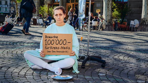 „Brauche 100.000,- für Krebs-Medis“, steht auf dem Pappschild einer Bettlerin auf dem Zürcher Paradeplatz. Samt Infusionsständer sitzt sie im Krankenhaushemd auf dem Bürgersteig und fragt Passanten, ob sie ihre Therapie im Zweifelsfall bezahlen würden. Die Frau ist weder krebskrank noch bettelt sie wirklich um Geld. Sie ist eine bezahlte Schauspielerin, die die NGO Public Eye engagiert hat, um auf die Preise neuer Krebsmedikamente aufmerksam zu machen. Die parteipolitisch unabhängige Organisation hat am Dienstag eine umfassende Kampagne gestartet, mit der sie die Unternehmen auffordert, ihre Preise zu senken und die Schweizer Regierung dazu bringen will, Zwangslizenzen auf neue Krebstherapien von Roche und Novartis einzusetzen.