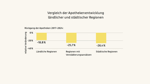 Die meisten Schließungen habe es zwischen 2017 und 2024 in städtischen Regionen (minus 26,4 Prozent) und Regionen mit „Verstädterungsansätzen“ (minus 25,7 Prozent) gegeben, während auf dem Land der Rückgang bei 18,8 Prozent lag. „Sowohl relativ als auch absolut ist die Zahl der Apotheken in den städtischen Regionen am stärksten zurückgegangen. Erheblich niedriger war der Rückgang der Apothekenzahl in den ländlichen Regionen.“