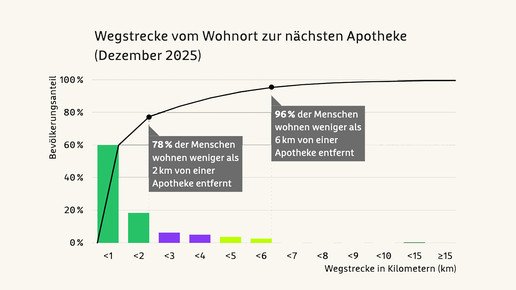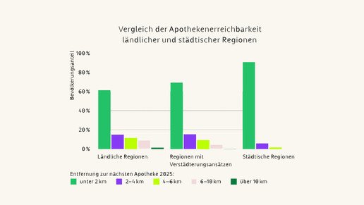 Auch in ländlichen Regionen kommen mehr als 60 Prozent der Menschen auf eine Apotheke im Umfeld von 2 Kilometern, während es in Regionen mit „Verstädterungsansätzen“ rund 70 Prozent und in Städten rund 90 Prozent sind.