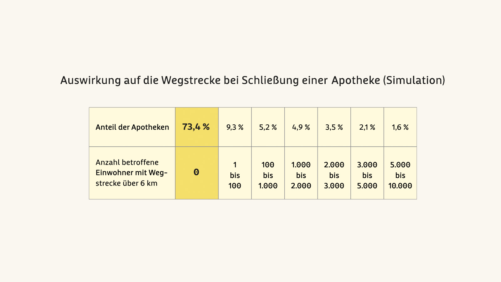 Weiter zeige sich, dass die Schließung von zusätzlichen Standorten für den größten Teil der Bevölkerung keine weiteren Wege zur Apotheke bedeuten würde, da eine andere Apotheke erreichbar wäre. So würde bei 73,4 Prozent der Apotheken kein einziger Kunde mehr als 6 Kilometer zur nächsten Apotheke zurücklegen müssen, denn im Einzugsgebiet gebe es zumindest eine Alternative. Bei 9,3 Prozent der Standorte wären bis zu 100 Menschen betroffen, bei 5,2 Prozent bis zu 1000 Menschen.