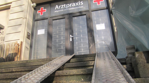 Apotheken müssen laut Apothekenbetriebsordnung (ApBetrO) barrierefrei erreichbar sein. Zwar besteht Bestandsschutz, doch spätestens bei der Übergabe an den Nachfolger muss eine Lösung gefunden werden, sonst droht die Schließung. Für Ärzte gibt es keine entsprechende Regel – und tatsächlich ist der Großteil der Arztpraxen nicht barrierefrei erreichbar. Der Sozialverband fordert einen Millionenzuschuss.