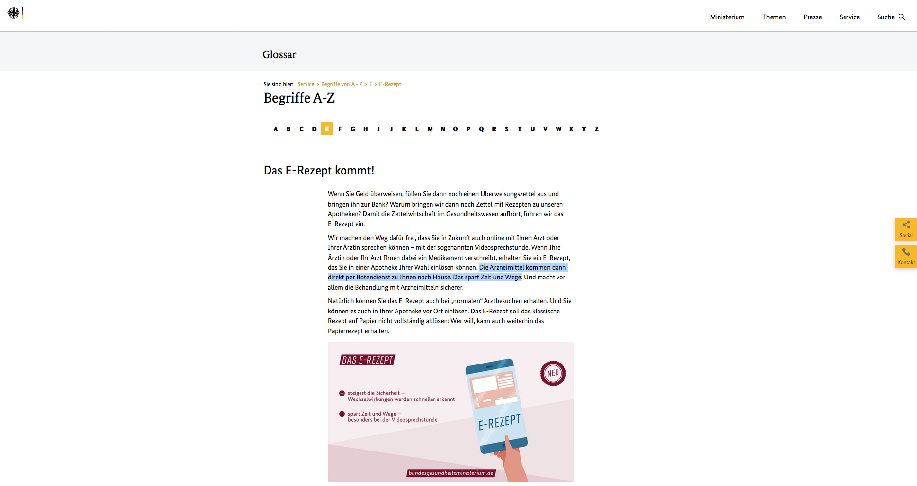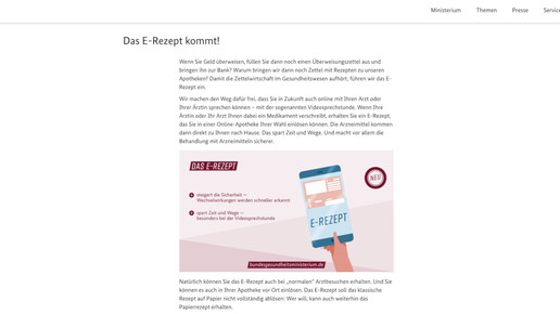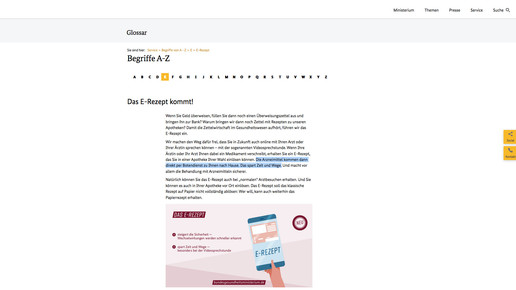 Im Glossar-Eintrag zum E-Rezept verweist das BMG zunächst auf die Möglichkeit der Video-Sprechstunde. Patienten könnten künftig auch online mit ihrem Arzt sprechen. In der ersten Fassung hieß es anschließend: „Wenn Ihre Ärztin oder Ihr Arzt Ihnen dabei ein Medikament verschreibt, erhalten Sie ein E-Rezept, das Sie in einer Online-Apotheke Ihrer Wahl einlösen können.“ Der Protest der Apotheker wurde in der Folge geliefert wie bestellt.