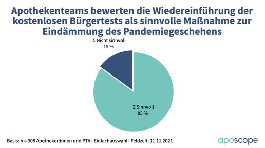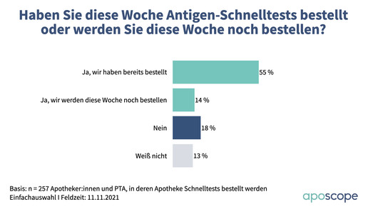 Tatsächlich rechnen mehr als zwei Drittel der Befragten mit einem Ansturm auf die Testzentren ab kommender Woche (68 Prozent). Jede dritte Apotheke will sich laut Umfrage ab kommender Woche beteiligen, indem sie Schnelltests und/oder überwachte Selbsttests unter Aufsicht anbietet. 56 Prozent wollen nicht mitmachen, 9 Prozent sind noch unentschieden.