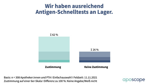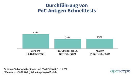 Zum Vergleich: 43 Prozent der Befragten gaben an, dass ihre Apotheke bis zum 11. Oktober PoC-Antigen-Schnelltests durchgeführt hat, 55 Prozent waren auch damals nicht dabei. Aktuell testen noch 28 Prozent der Apotheken, pro Tag werden in den meisten Fällen zwischen 15 und 20 Tests durchgeführt, der Preis liegt im Durchschnitt bei 15 Euro. 70 Prozent beteiligen sich derzeit nicht an den Tests für Selbstzahler.