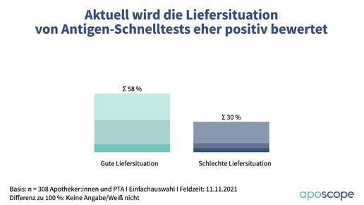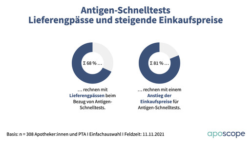 Schon jetzt bewerten 30 Prozent die Liefersituation als angespannt, 58 Prozent sehen diesbezüglich allerdings noch keine Probleme, 62 Prozent haben nach eigenem Bekunden derzeit ausreichend Schnelltests an Lager. 55 Prozent der Teilnehmer:innen, die Schnelltests bestellen, haben in dieser Woche noch einmal geordert, weitere 14 Prozent planen dies akut. Eine deutliche Mehrheit von 81 Prozent geht nämlich auch davon aus, dass die Einkaufspreise anziehen werden.