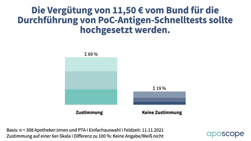 Eine Mehrheit von 69 Prozent ist der Meinung, dass die Vergütung für die Durchführung von PoC-Antigen-Schnelltests erhöht werden sollte. Aktuell sind vom Bundesgesundheitsministerium (BMG) analog zur ersten Runde 8 Euro je Test zuzüglich 3,50 Euro für das Material vorgesehen.