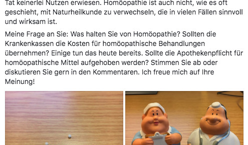 Im Zusammenhang mit der Umfrage werden Thesen von Befürwortern und Gegnern der Homöopathie kurz und knapp angeschnitten: „Auf der einen Seite wollen viele Menschen nicht auf sie verzichten und halten sie für eine sinnvolle Alternative zur Medizin. Die Gegenseite hält sie vor allem für ein Geschäft – ohne wissenschaftliche Evidenz. Wissenschaftlich ist in der Tat keinerlei Nutzen erwiesen. Homöopathie ist auch nicht, wie es oft geschieht, mit Naturheilkunde zu verwechseln, die in vielen Fällen sinnvoll und wirksam ist.“ Ihre eigene Meinung zum Thema Homöopathie gibt sie in diesem Post nicht bekannt.